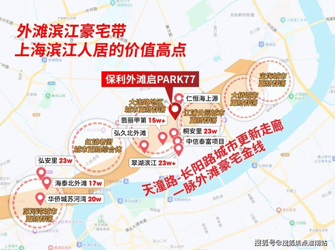 华侨城苏河湾(20w+)、弘安里(23w)、海泰北外滩(17w)等高端住宅星罗棋布,保利外滩启PARK77便扎根这条外滩滨江豪宅金线,与其它豪宅共筑滨江人居高点。